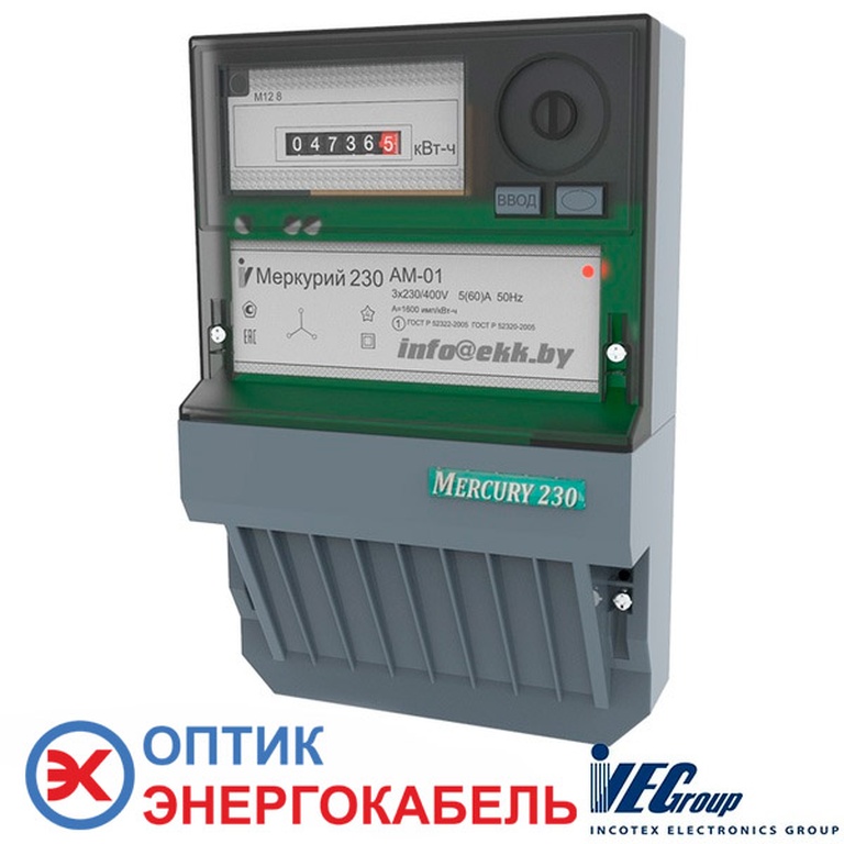 Электросчетчик Меркурий 230 АМ-01 — это счетчик, который предназначен для учета активной электрической энергии в трехфазных трех- или четырехпроводных сетях переменного тока на максимальный ток непосредственного включения до 60 А внутри закрытых помещений.