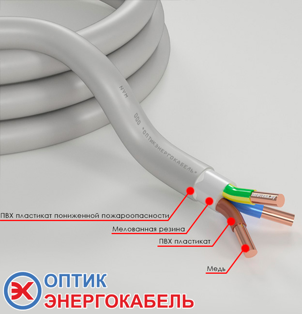 Кабель NYM — это силовой кабель, который имеет токопроводящие медные жилы в изоляции из ПВХ и промежуточную оболочку из невулканизированной резиновой смеси, что обеспечивает круглую форму, повышает безопасность и увеличивает гибкость кабеля.