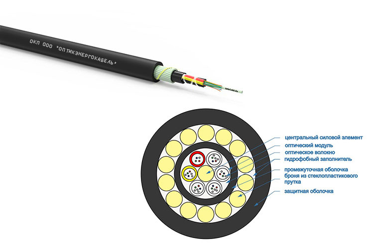 Кабель марки ОКП – оптический кабель, диэлектрический, бронированный стеклопластиковыми прутками. Предназначен для прокладки в грунтах, кабельной канализации, туннелях, коллекторах.